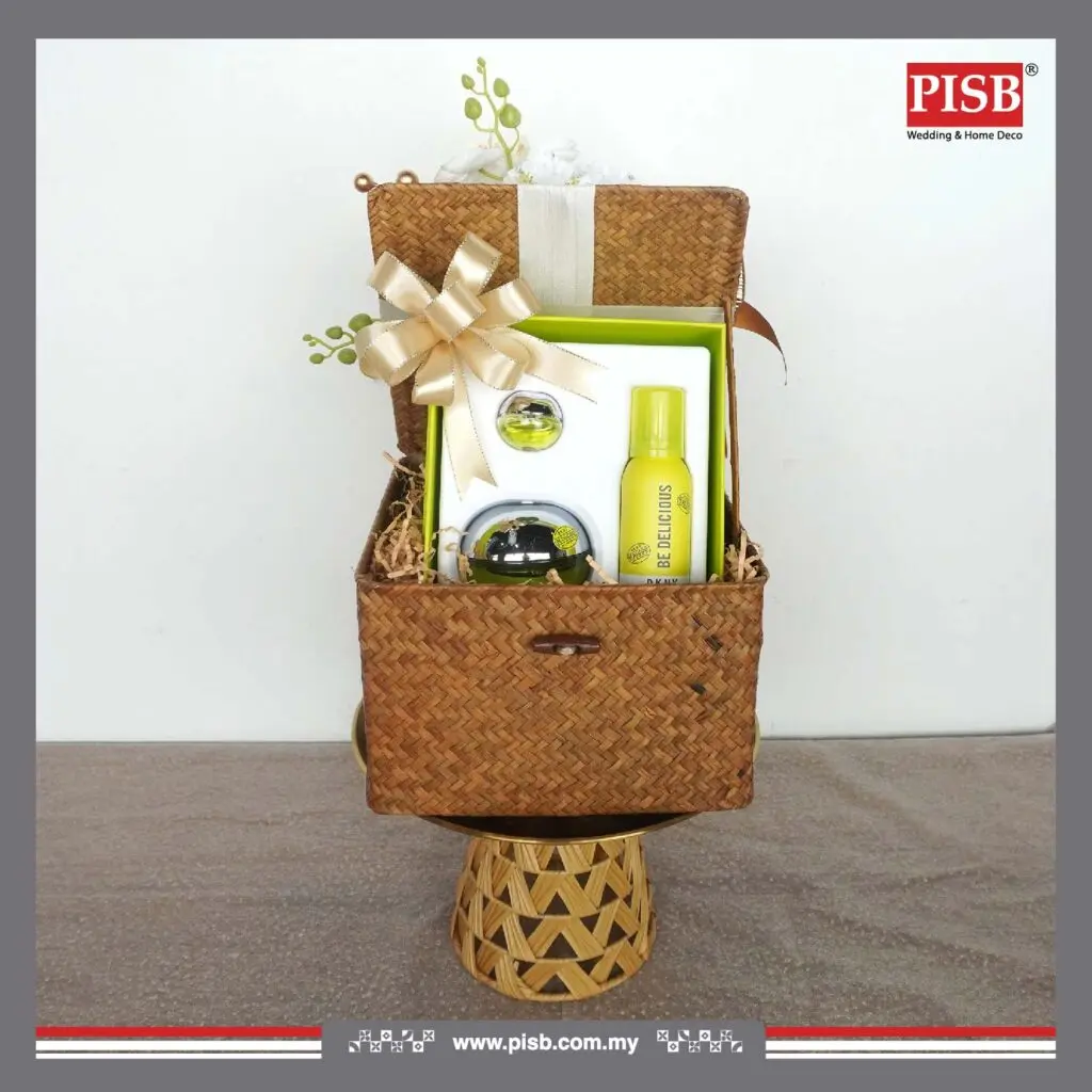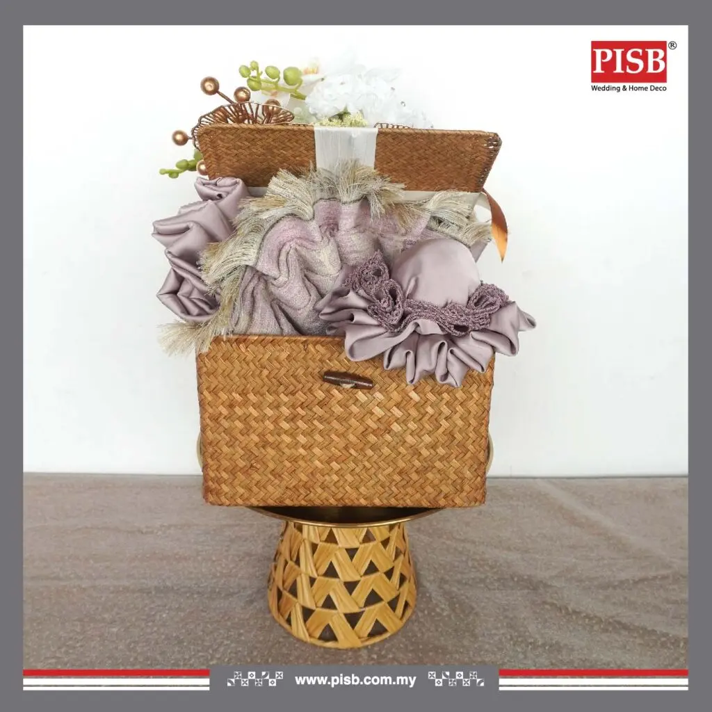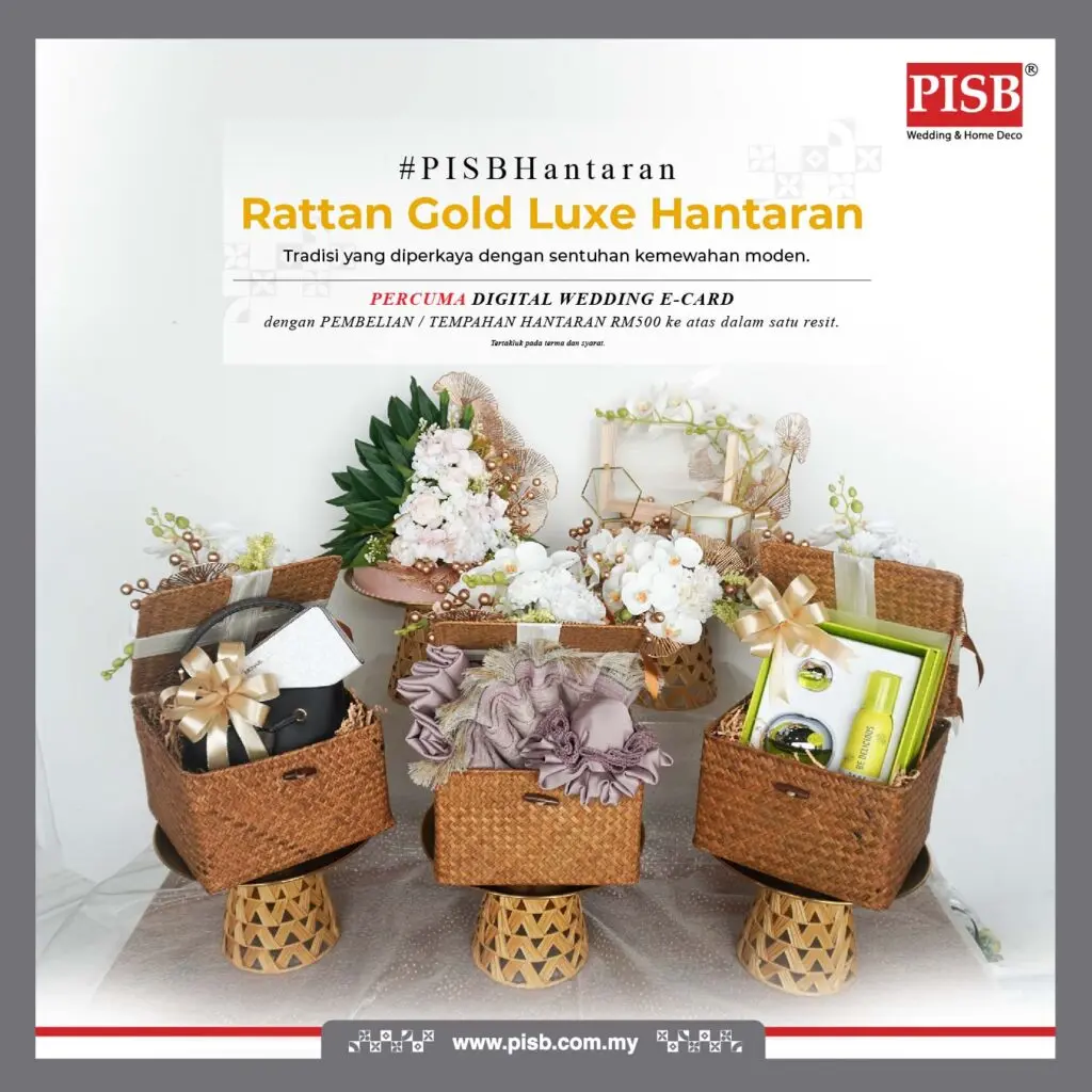 A refined fusion of natural charm and modern luxury, this exclusive PISB hantaran collection features elegant rattan textures enhanced with gold details — bringing warmth, sophistication, and timeless beauty to your wedding or engagement ceremony.